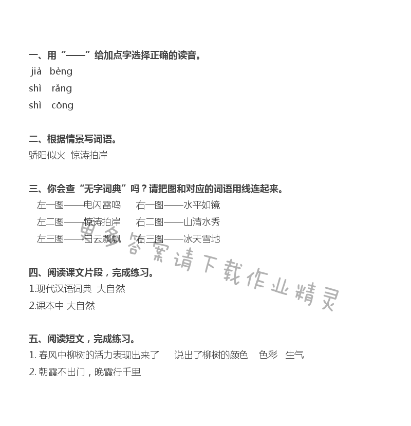 一、用“——”给加点字选择正确的读音。jià bèng shì rǎng shì cōng二、根据情景写词语。骄阳似火惊涛拍岸三、你会查“无字词典”吗?请把图和对应的词语用线连起来。 左一图——电闪雷鸣 右一图——水平如镜 左二图——惊涛拍岸 右二图——山清水秀 左三图——白云飘飘 右三图——冰天雪地四、阅读课文片段,完成练习。1.现