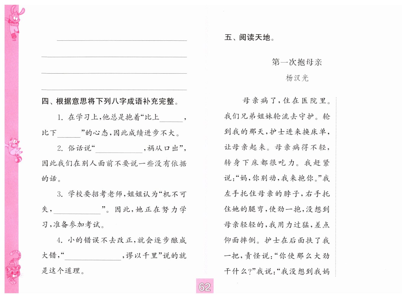 1. 有关语句:短文第2自然中“我”回答护士的话。因为在“我”的记忆中,“我”小时候母亲“总是”手拉肩挑,翻山越岭;“我们”长大后,遇到重活了,母亲“总是”让“我们”放下。“我”一直以为母亲力大无穷,没想到她一直承受着那么重的担子,“我”很愧疚。“我”的第一次与母亲的“总是”形成鲜明对比,所以“我”很难过。