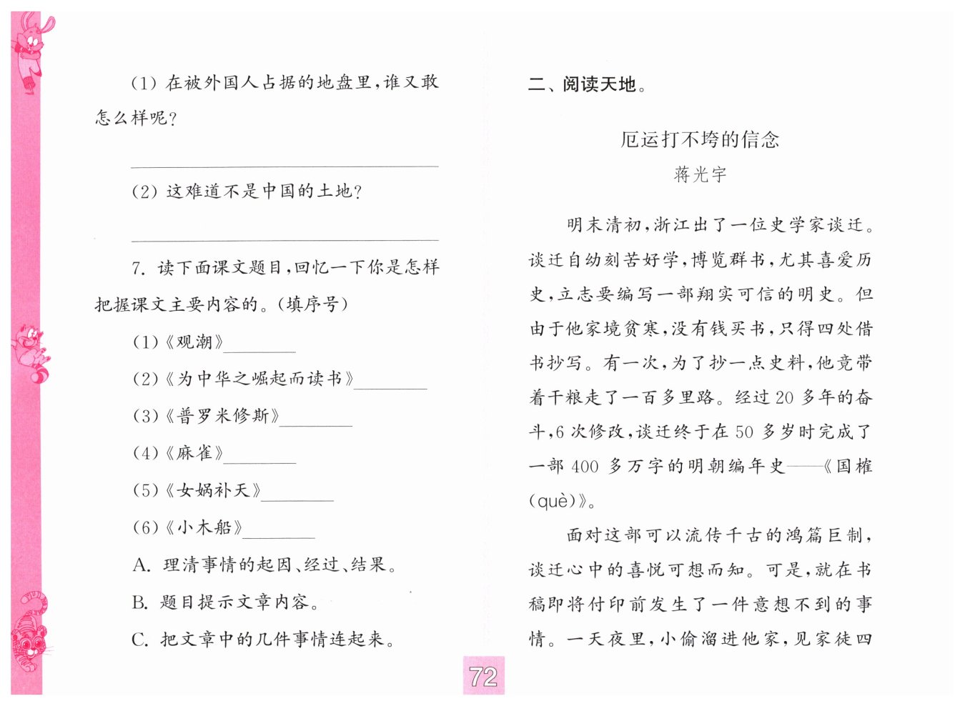 1. 短文主要写谈迁即将付印的书稿被偷后,他重新撰写,新的书稿内容更翔实、精彩。
