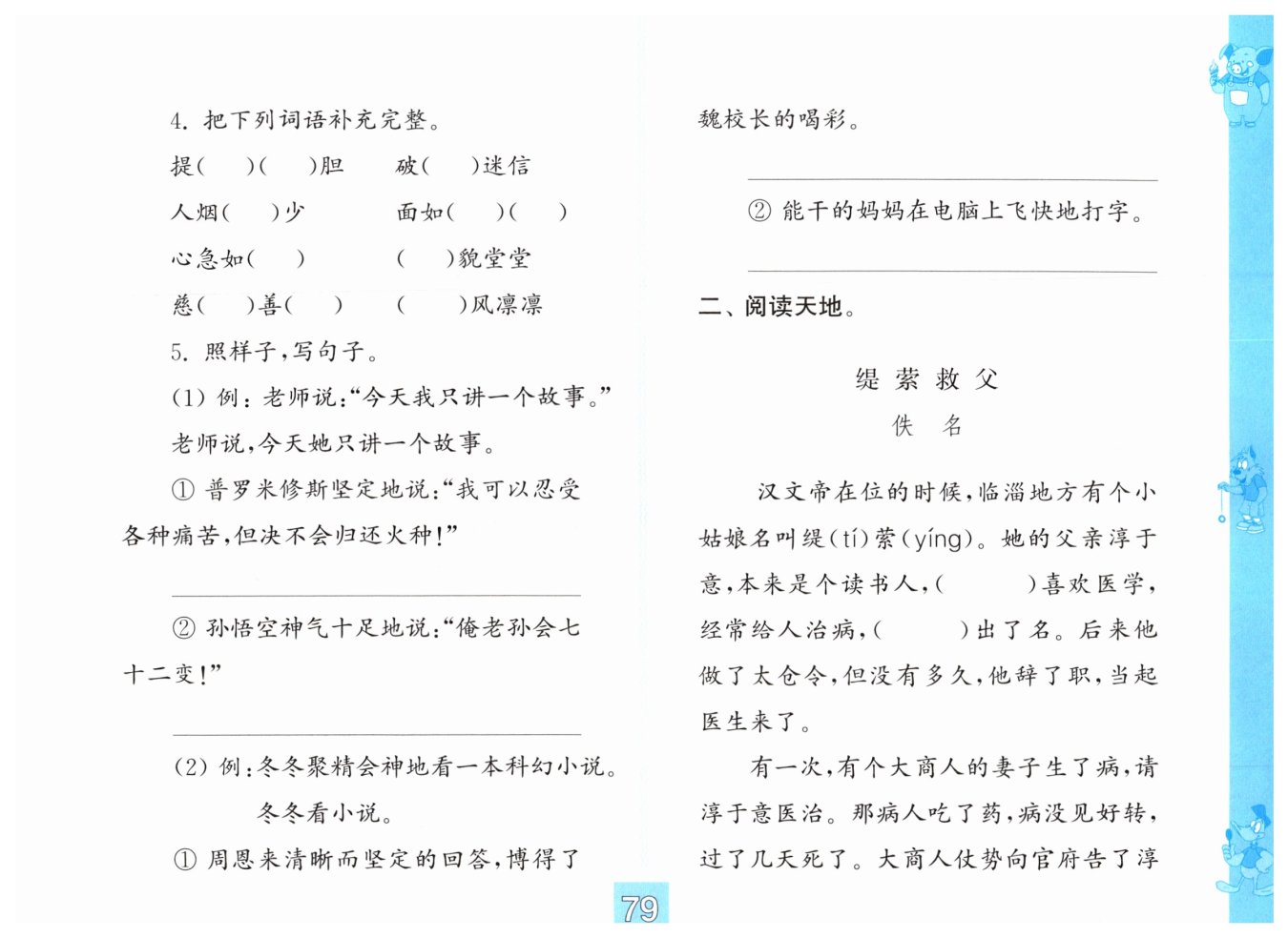 4. ① 平日缇萦父亲治病救人,为官清廉;② 缇萦替父赎罪的壮举,令人敬佩;③ 遇到一位明事理的好皇帝。
