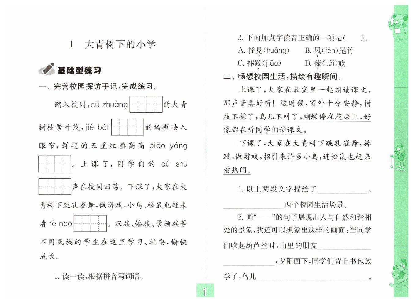 1. 示例:上课读课文 下课做游戏 2. 示例:和着音乐摇头晃脑 站在枝头依依不舍地望着同学们