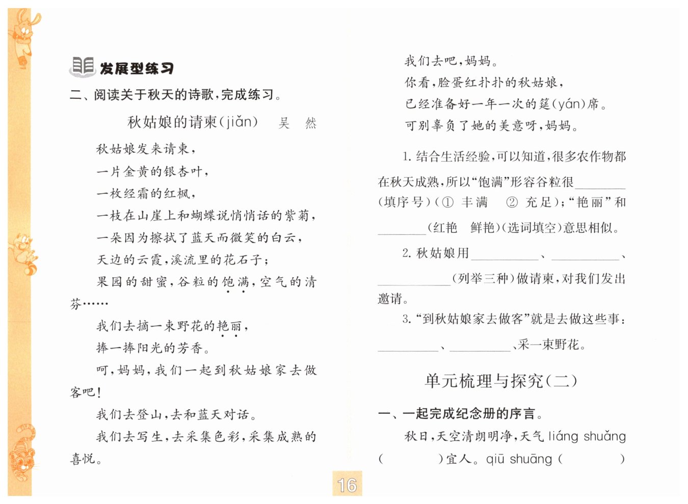 1. 凉爽 秋霜 石径 脚印 凌乱 丰收 2. 累累硕果(桂子飘香) 示例:草长莺飞 骄阳似火