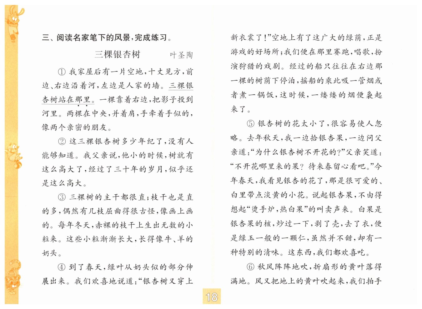 1. A 2. 春天 银杏果 绿叶长成树荫,花容易被忽略。 虽然不甜,却有一种特别的清味。 折扇形的黄叶落得满地。 3. ABD