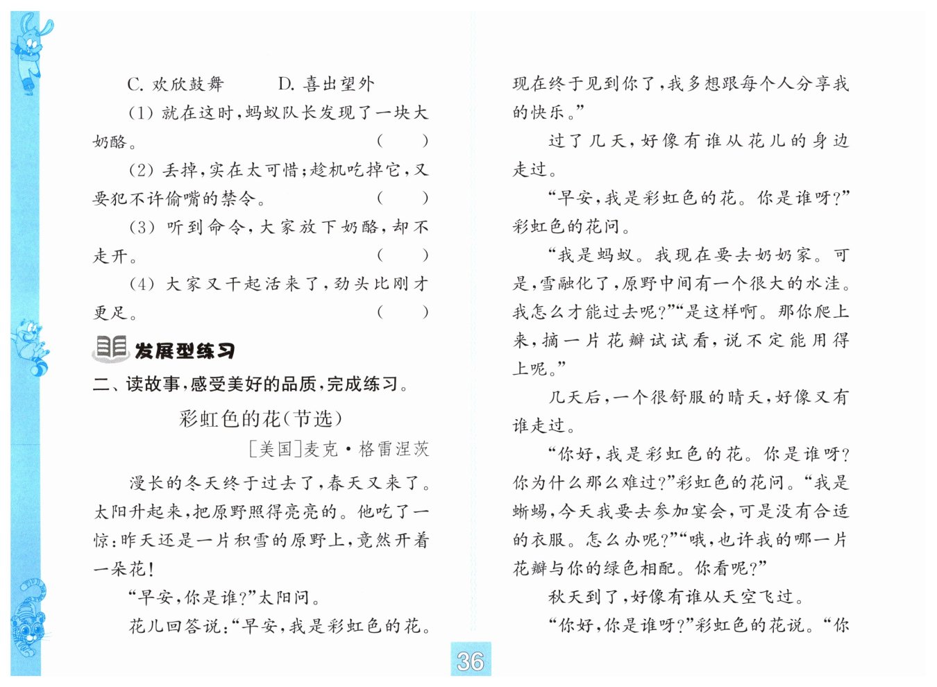 1. 要点:跟每个人分享快乐 2. 示例:(第一行)蚂蚁 摘片花瓣当作船 (第二行)没有合适的衣服参加宴会 摘片花瓣当衣服 (第三行)小鸟 没有合适的礼物给 女儿 3. 能够与本文情境相勾连就可以。