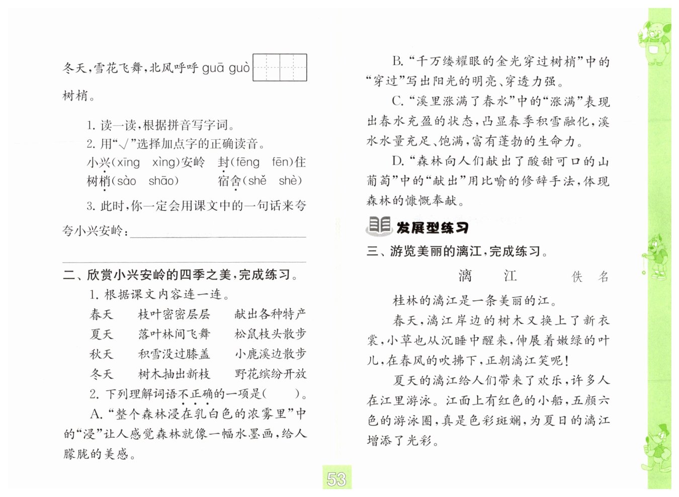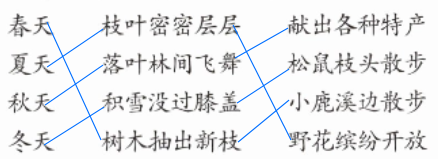 1. 春天——树木抽出新枝——小鹿溪边散步 夏天——枝叶密密层层——野花缤纷开放 秋天——落叶林间飞舞——献出各种特产 冬天——积雪没过膝盖——松鼠枝头散步 2. D