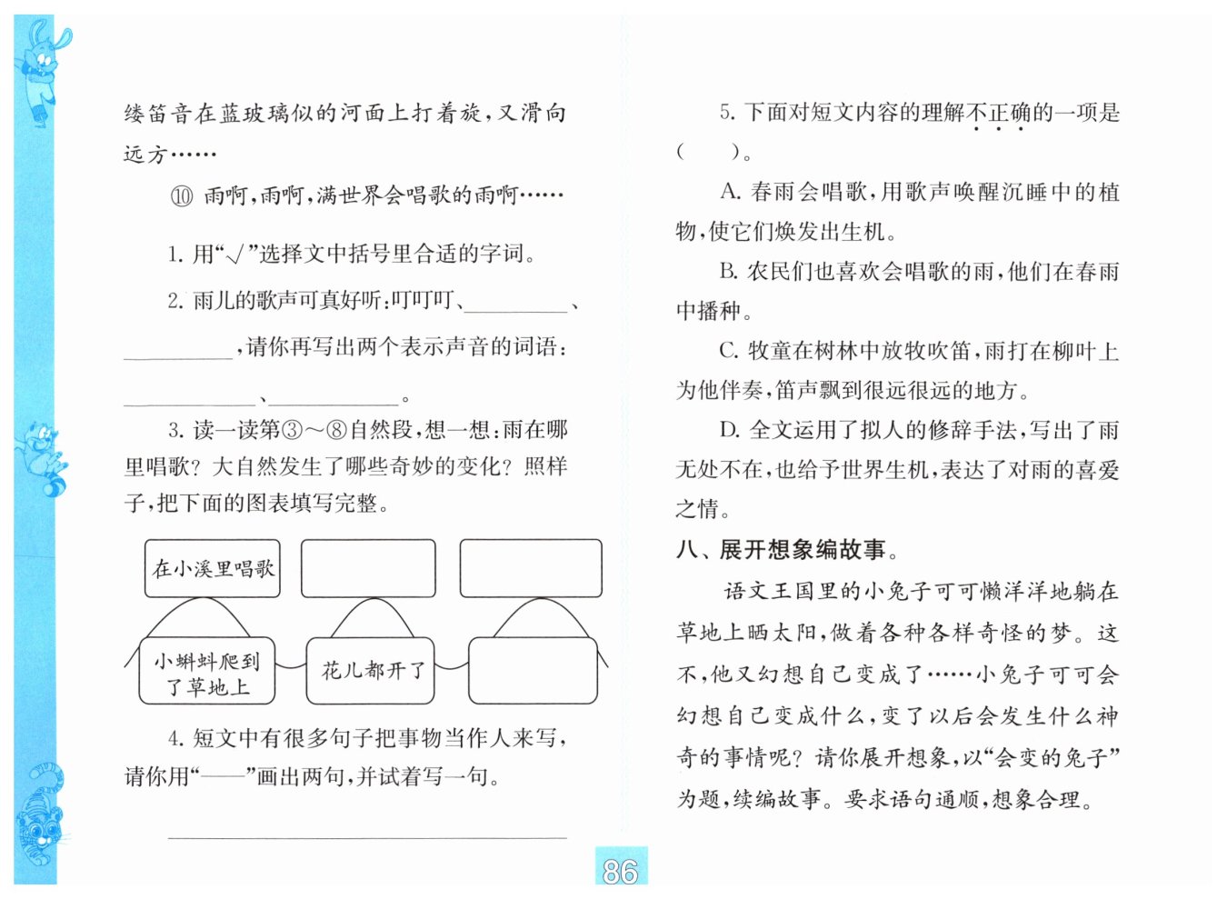 语文王国里的小兔子可可懒洋洋地躺在草地上晒太阳,做着各种各样奇怪的梦。这不,他又幻想自己变成了一只小鸟。