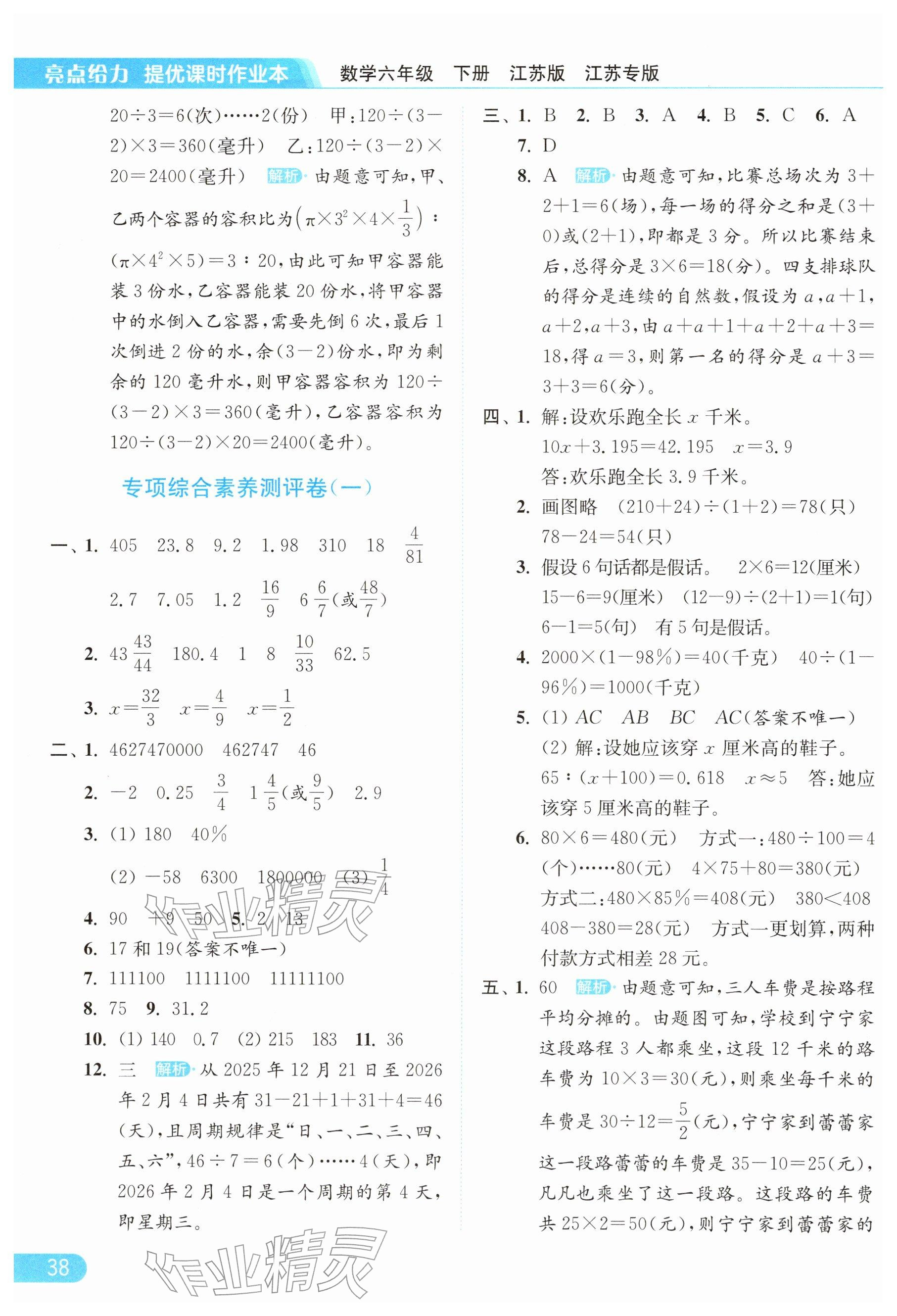 2026年亮点给力提优课时作业本六年级数学下册苏教版参考答案第38页