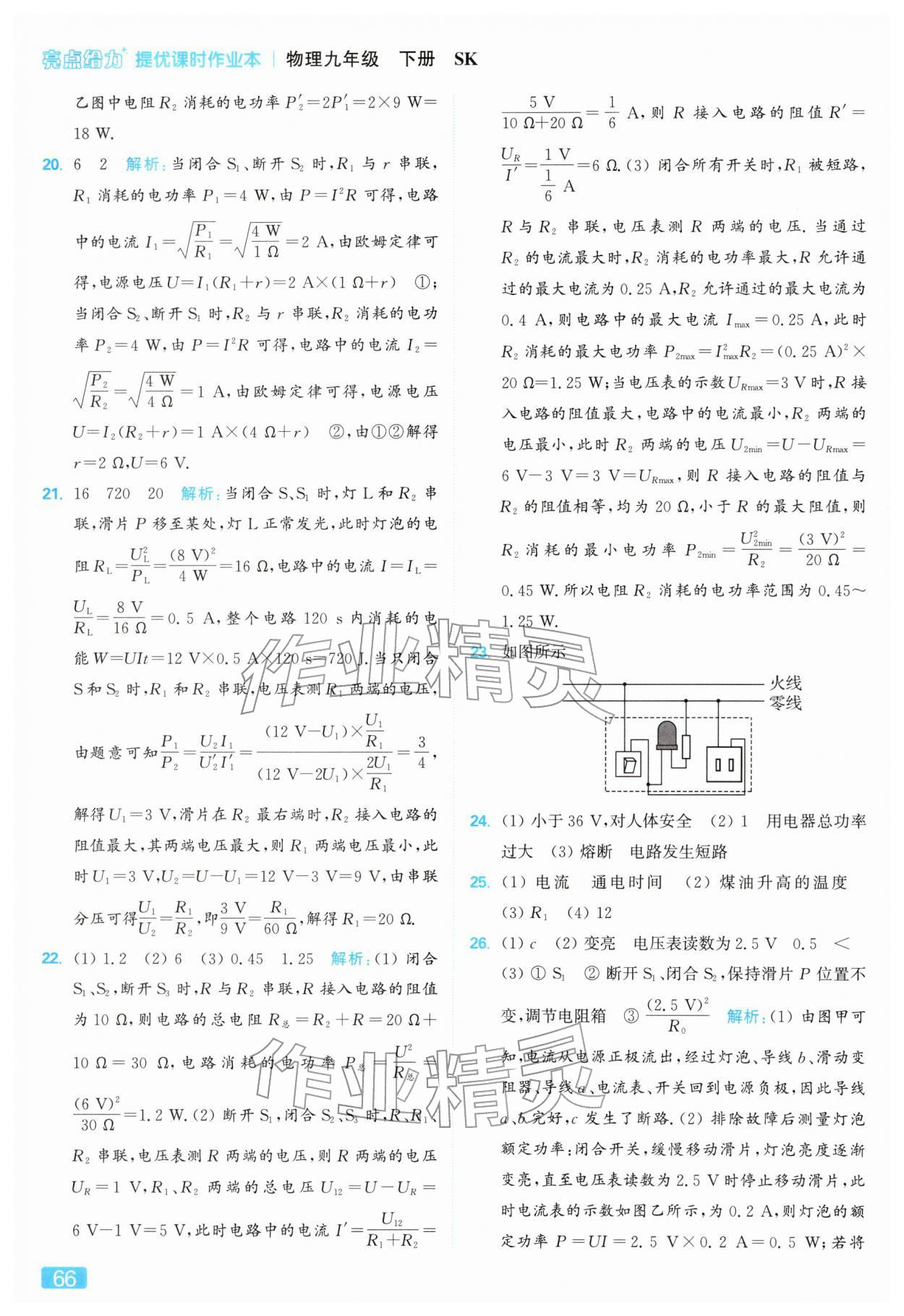 2026年亮点给力提优课时作业本九年级物理下册苏科版参考答案第66页