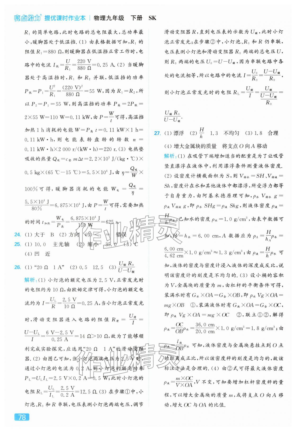 2026年亮点给力提优课时作业本九年级物理下册苏科版参考答案第78页