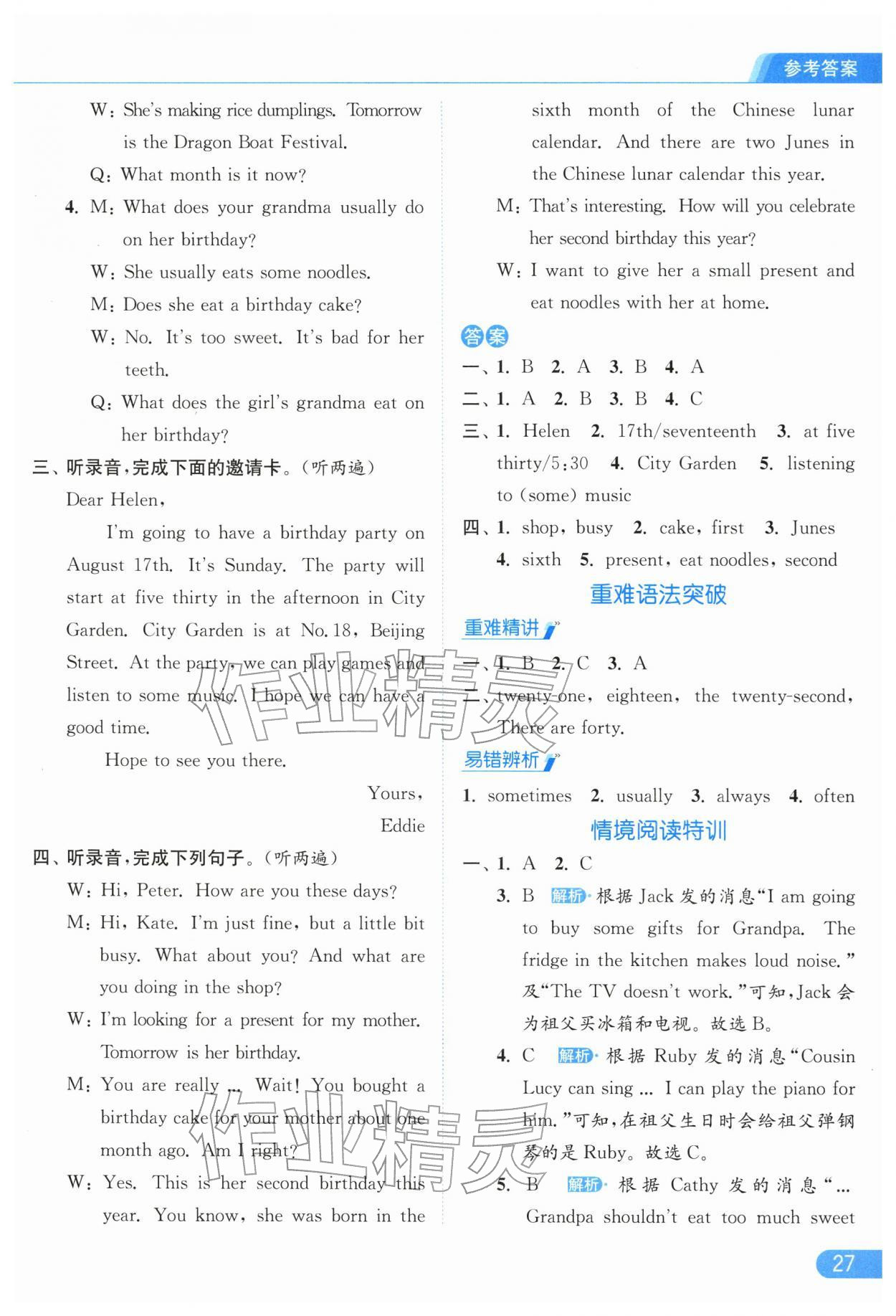 2026年亮点给力提优课时作业本五年级英语下册译林版参考答案第27页