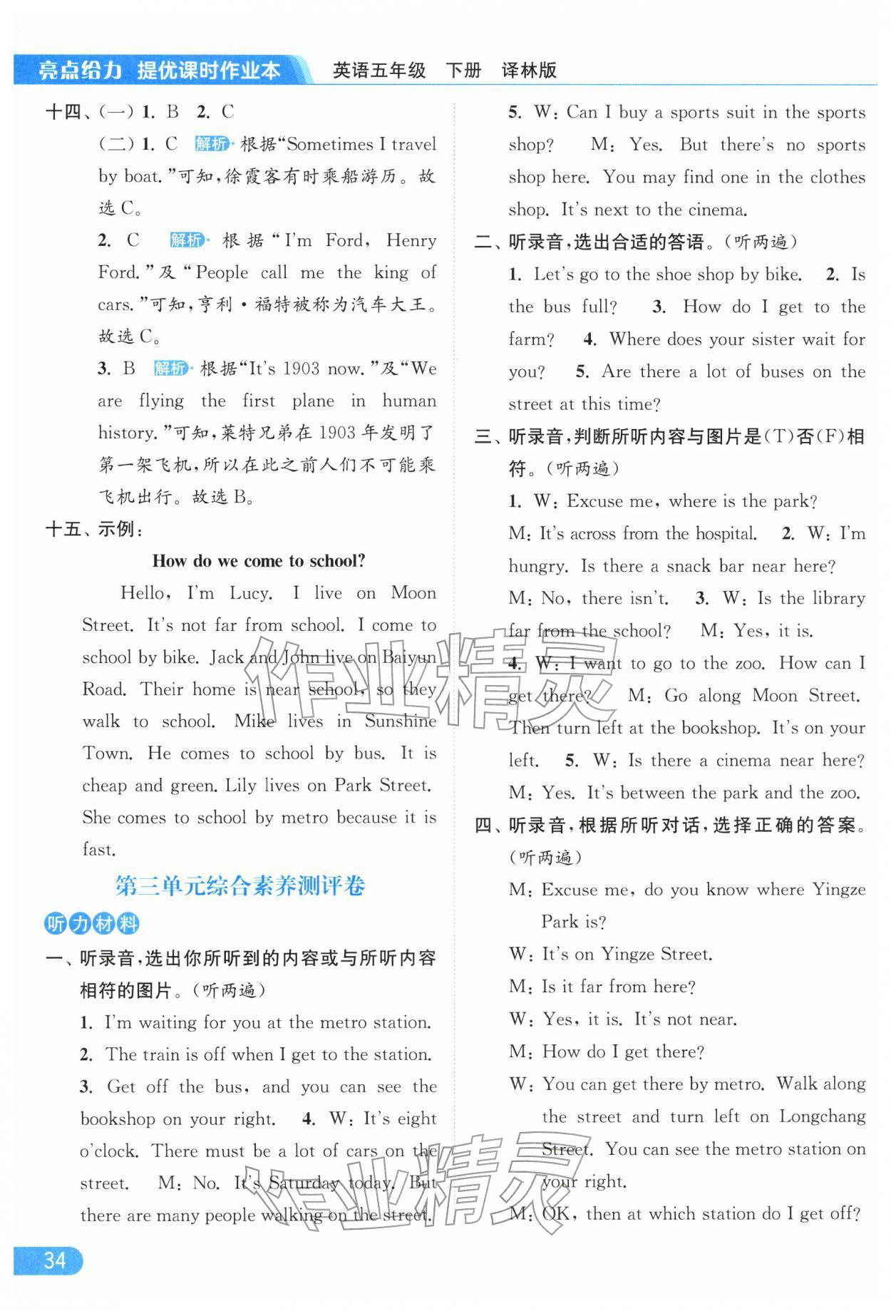 2026年亮点给力提优课时作业本五年级英语下册译林版参考答案第34页