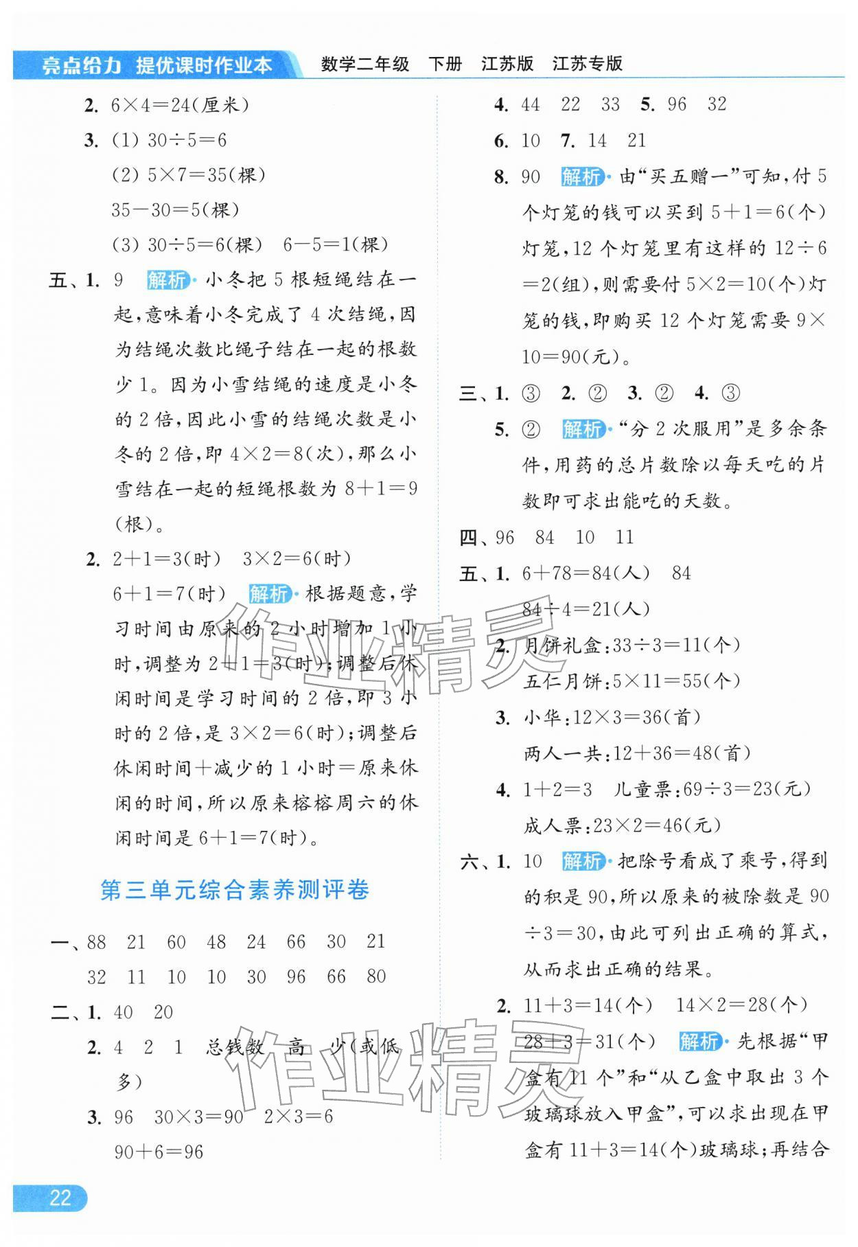 2026年亮点给力提优课时作业本二年级数学下册苏教版江苏专版参考答案第22页