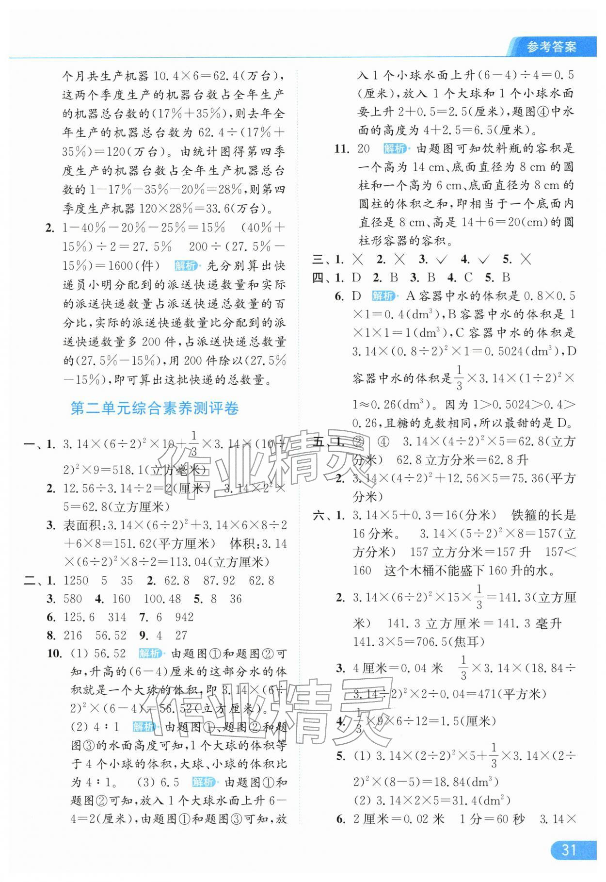 2026年亮点给力提优课时作业本六年级数学下册苏教版江苏专版参考答案第31页