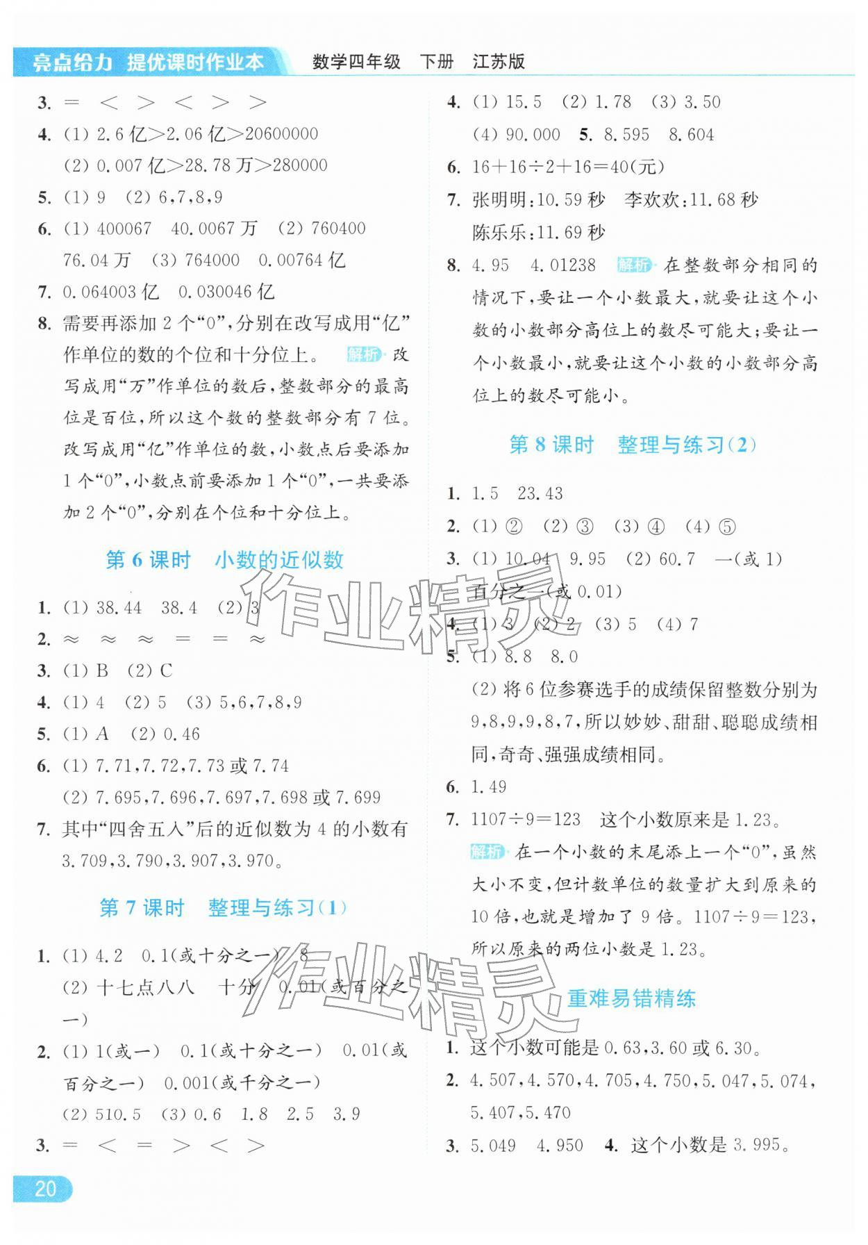 2026年亮点给力提优课时作业本四年级数学下册江苏版参考答案第20页