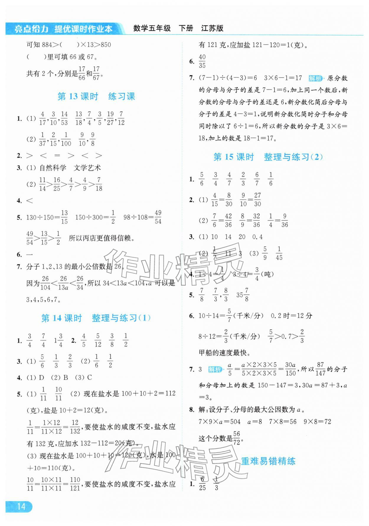 2026年亮点给力提优课时作业本五年级数学下册江苏版参考答案第14页