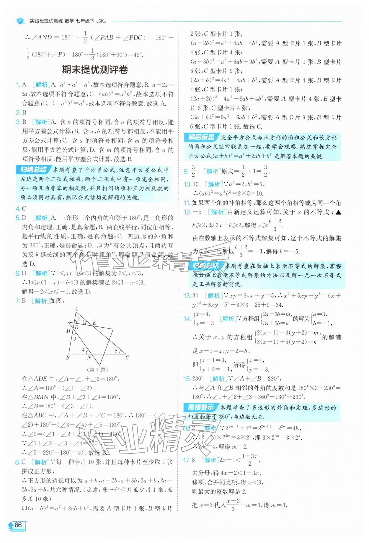 2026年实验班提优训练七年级数学下册苏科版参考答案第86页