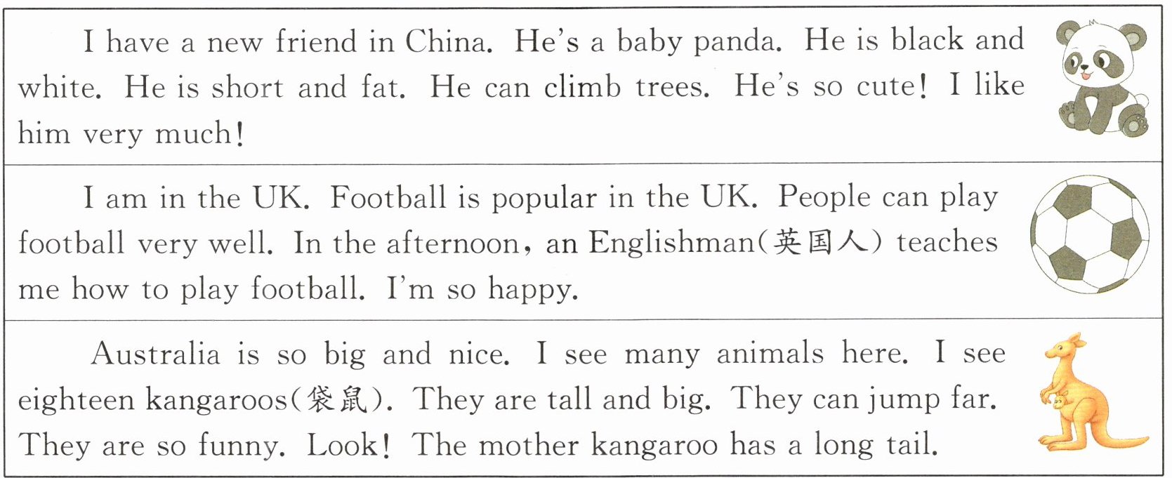 3. 由文中“Australia is so big and nice ... I see eighteen kangaroos.”可知,Sarah能在澳大利亚看见袋鼠,袋鼠来自澳大利亚,故选C。