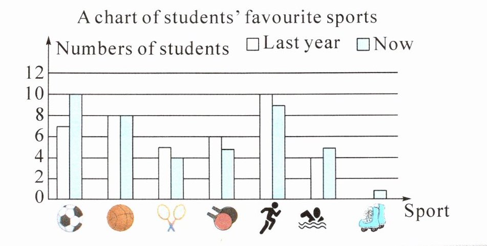 This is a survey about students' favourite sports. Alan is surprised to find that some of his classmates have changed their favourite sports over the past year. He asked the reason for the changes. Karl said, "Last year, I liked table-tennis best. But now I like basketball best because I can make more new friends when I play basketball." Anna said, "I couldn't swim last year. Now I can swim and I like swimming best. I feel relaxed under the water."