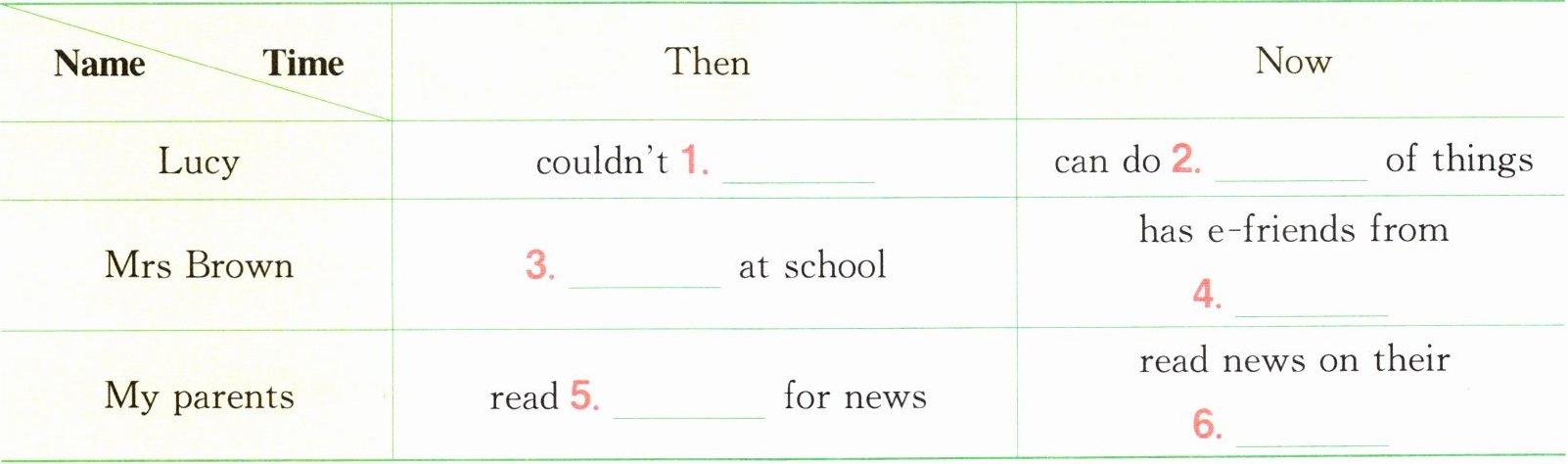 答案:1. draw 2. lots 3. made friends 4. all over the world 5. newspapers 6. computers