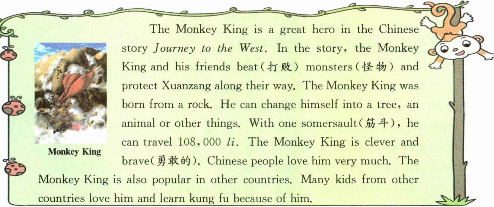(一)1. 由短文第一句可知,美猴王是中国神话故事《西游记》里的角色。故本题表述错误。