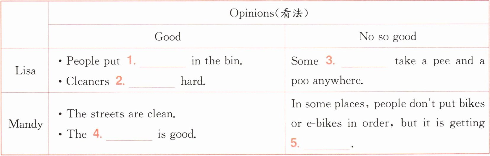曼迪:我认为我们的城市很干净。街道很干净,空气也很好。但有些地方有点乱。人们没有把自行车或电动自行车摆放整齐。有时他们甚至把自行车和电动自行车放在人行道中间。这让我很生气。好的一点是情况正在好转。大多数街道都干净整洁。