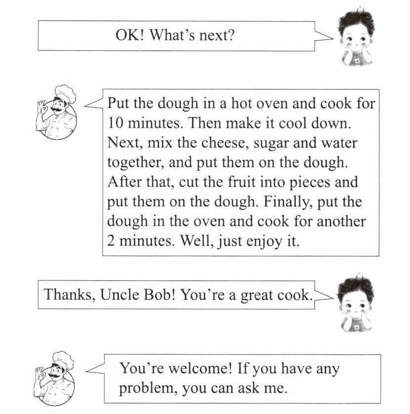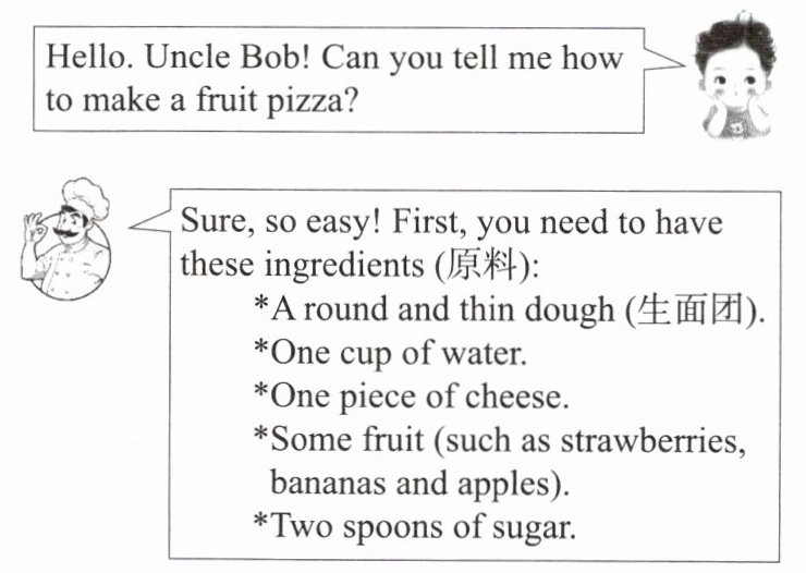 It's Saturday evening. Henry plans to make a fruit pizza(比萨饼) for his friends because they will visit him on Sunday afternoon. But Henry doesn't know how to make it, so he asks Uncle Bob for help on WeChat.