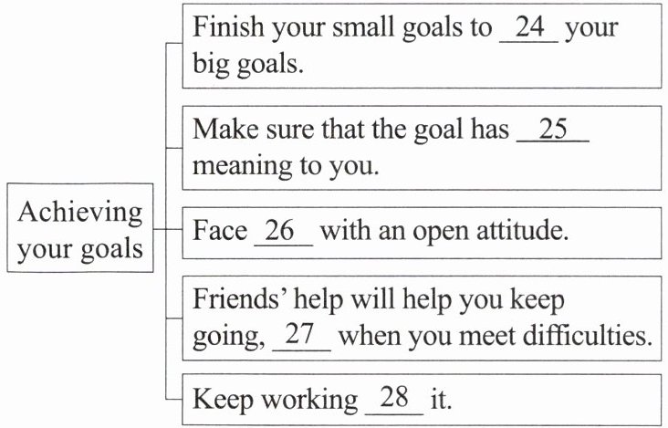 24.achieve 根据“Small wins are ways to achieve a bigger goal.”可知,完成小目标是实现大目标的途径。故填achieve。