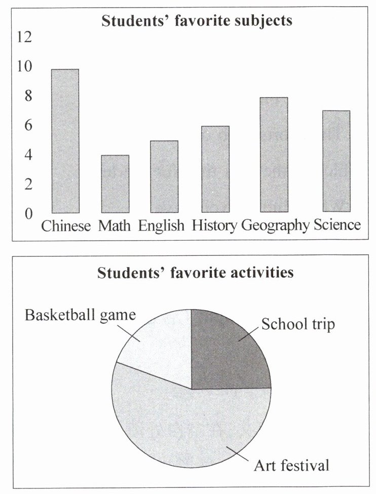 Hello, my name is David. I study in No. 5 Middle School. I’m in Class 2, Grade 7. Here is a survey (调查) about my classmates’ favorite subjects and activities(活动).