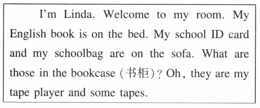 答案:21 D 细节理解题。根据Linda描述中的“What are those in the bookcase? Oh,they are my tape player and some tapes.”可知,Linda的磁带播放机在书柜中,故选D。