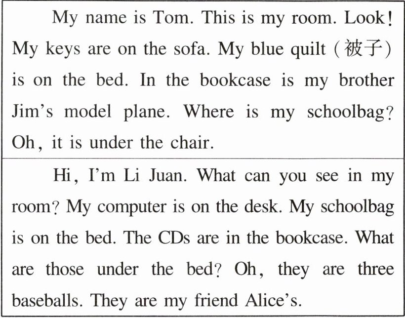 23 D 细节理解题。根据李娟描述中的“What are those under the bed? Oh,they are three baseballs.”可知,她的床下有三个棒球,故选D。