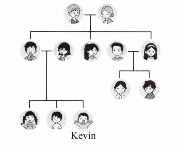 凯文和他的新朋友露西正在网上谈论他们的家庭。凯文给露西发了一张他家的家谱图。以下是这张图和他们的谈话。