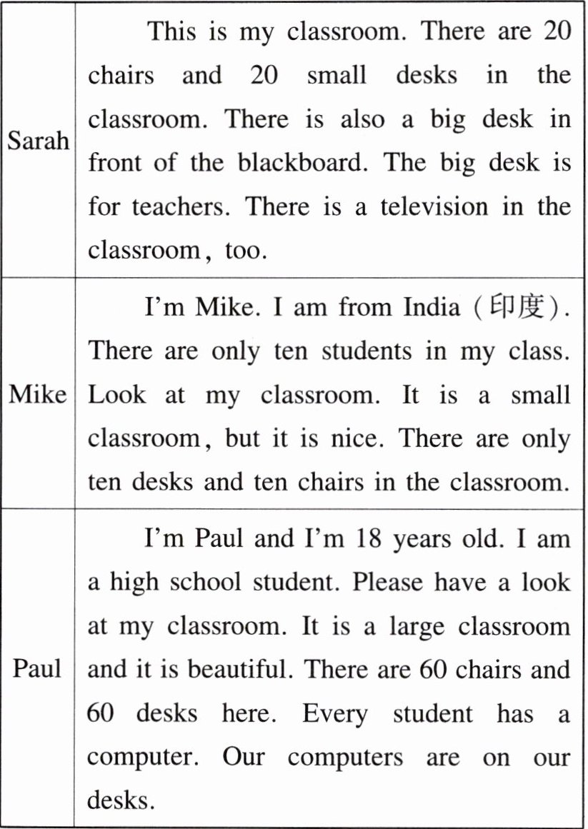 答案:Ⅲ.[语篇解读] 本文中 Sarah、Mike 和 Paul 分别介绍了自己的教室。 10.A 主旨大意题。通读全文可知,三个学生谈论的是他们的教室。故选 A。 11.D 推理判断题。通读Sarah的描述可知,她的教室里有椅子、桌子及电视,没有“电脑”,故选 D。 12.C 细节理解题。根据Paul的描述中提到的“I’m Paul and I’m 18 years old.”可知,文章中提到了Paul的年龄,故选C。