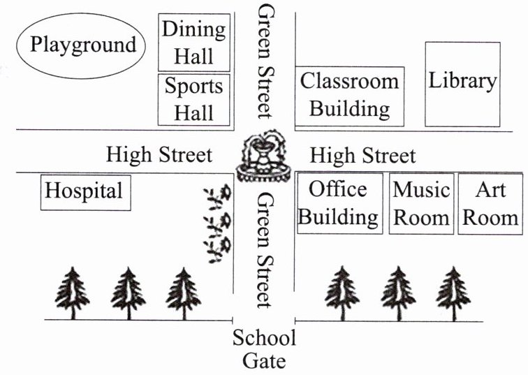 为了帮助琳达和艾玛更好地了解这所学校,艾米画了一张她学校的地图并寄给了琳达。现在琳达正在看这张地图。