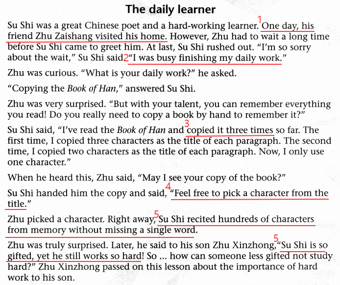 5. 答案:Because Su Shi was so gifted, yet he still worked so hard, and he could recite hundreds of characters from memory without missing a single word.