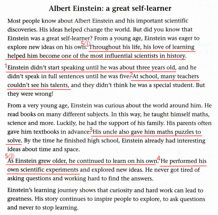 解析:结合第一段“Throughout his life, his love of learning helped him become one of the most influential scientists in history(在他的一生中,他对知识的热爱使他成为了历史上最具影响力的科学家之一。)”以及第四段“As Einstein grew older, he continued to learn on his own(随着爱因斯坦年龄的增长,他继续自学。)”等内容,可知他对学习的兴趣持续一生,所以该表述正确。