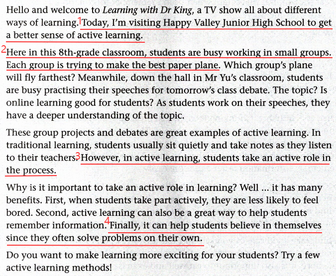 C Carrie is watching a TV show about active learning. Read the script and choose the best answer for each question.