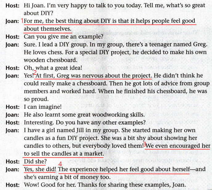 解析:根据琼说的第一句话“For me, the best thing about DIY is that it helps people feel good about themselves.”(对我来说,DIY最棒的地方在于它能帮助人们自我感觉良好。),可知选c。
