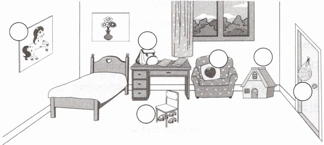 答案:五、提示:房子1,一幅马的图画2,篮球3,扶手椅4,书包5,汽车6。