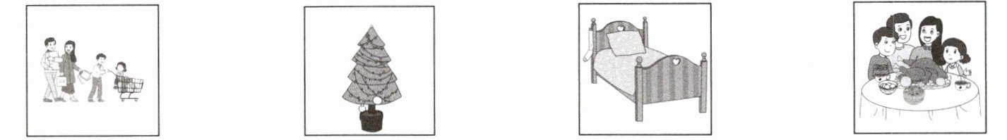 First, my parents, my sister and I go shopping. We buy a lot of presents for our family and friends. We also buy a big Christmas tree. Next, we put pretty things on the Christmas tree. It looks nice. Then, my sister and I put stockings on the beds. We wait for presents. Finally, Christmas Day comes. We have a big lunch. We all have a good time.