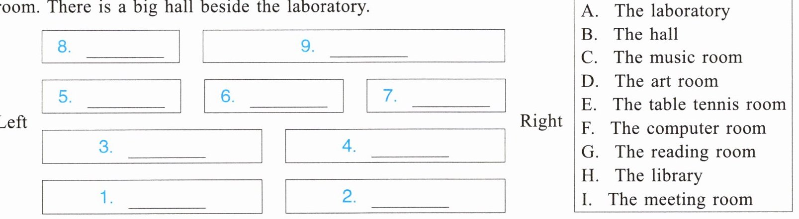 这栋楼有四层。乒乓球室和音乐室在一楼,在美术室和会议室的下方。乒乓球室和美术室都在楼的左侧。三楼有三个房间。图书馆在电脑室和阅览室之间。电脑室在图书馆的右侧。四楼也有两个房间。实验室在阅览室的上方。实验室旁边有一个大礼堂。