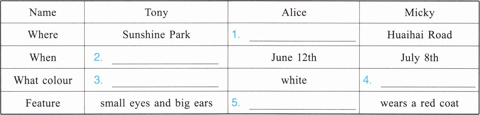 答案:1. Moon Street 2. May 1st 3. black 4. black and white 5. big eyes and a short tail