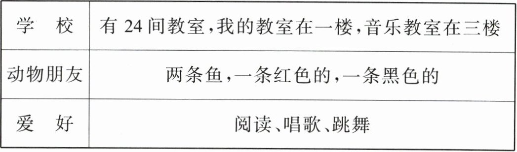 十一、Nancy是一位新学生,她想介绍一下自己的新学校、动物朋友和爱好。请你根据表格中的信息提示,帮助她写一写介绍。(10分)