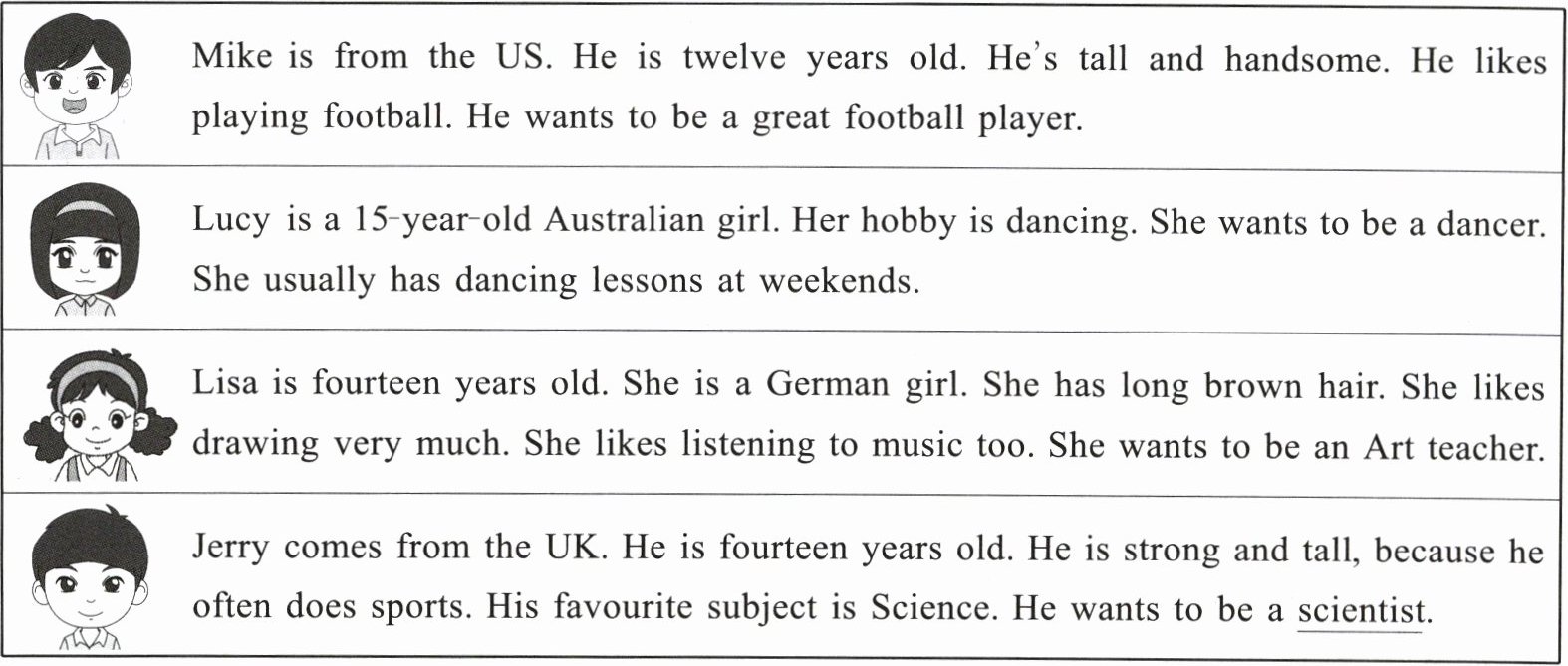 )5. Lisa's hobbies are dancing and listening to music. She wants to be an Art teacher.