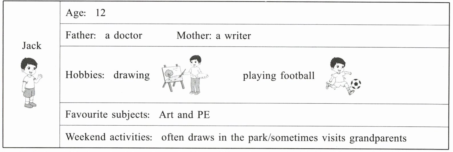 答案:范文:Hello, everyone. This is Jack. He is 12 years old. Jack has a happy family. His father is a doctor. He helps sick people every day. His mother is a writer. She writes many interesting stories. Jack has some great hobbies. He likes drawing and playing football. Drawing makes him feel relaxed and playing football makes him strong. His favourite subjects are Art and PE. He often draws in the park at weekends. Sometimes he visits his grandparents. He loves listening to their old-time stories. Jack is really a lovely boy.
