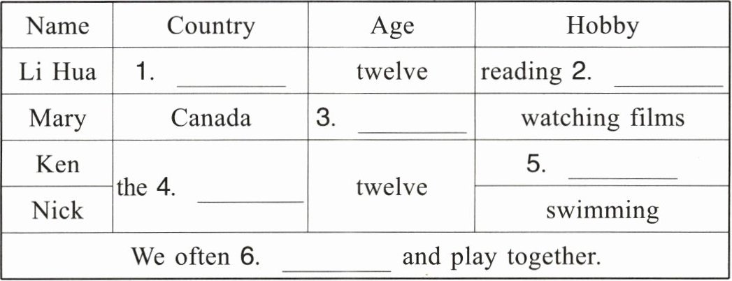 答案:1. China 2. stories 3. eleven 4. UK 5. skating 6. study