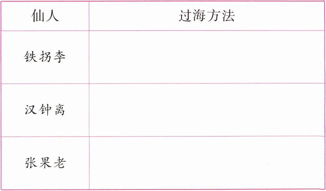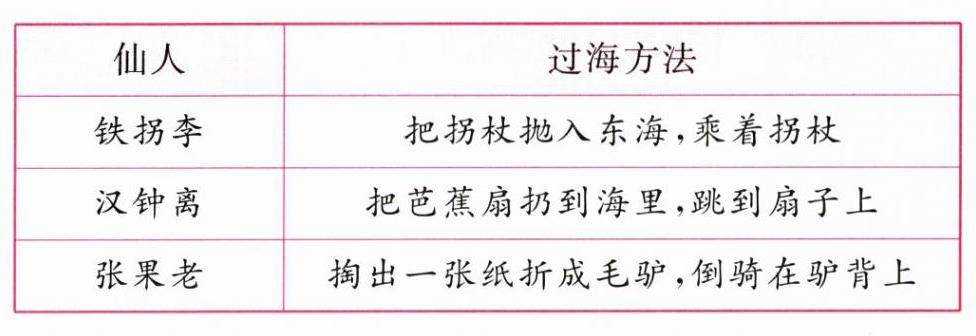 1. 用关键词概括以下三位仙人过海的方法,完成表格