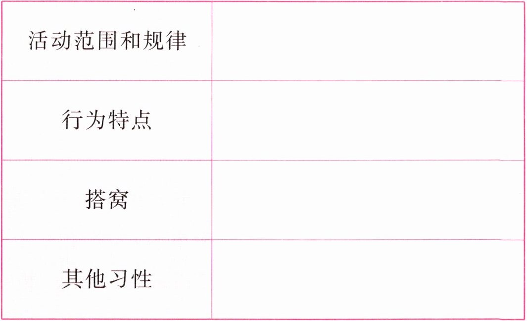 答案:2. 活动范围和规律 经常在高处活动;好像很害怕强烈的阳光,白天休息,晚上活动。