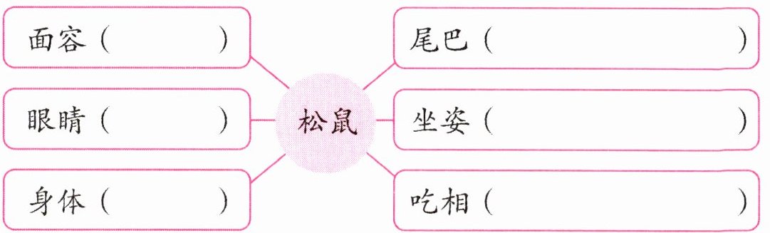 答案:(1)面容(清秀)、眼睛(闪闪发光)、身体(矫健)、尾巴(帽缨形、老是翘起来)、坐姿(直竖着身子)、吃相(用前爪往嘴里送东西吃)