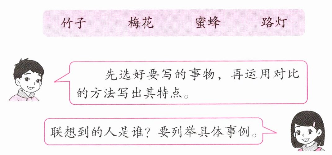 答案:示例:蜜蜂让我想到辛勤工作、无私奉献的社区志愿者们。无论是炎热的夏天,还是寒冷的冬天,他们都默默地为社区的居民服务,引导居民进行垃圾分类、筛查安全问题、照顾生活有困难的老人……志愿者走到哪里,就把方便和微笑带到哪里!