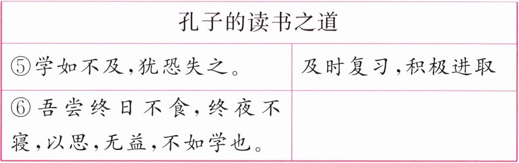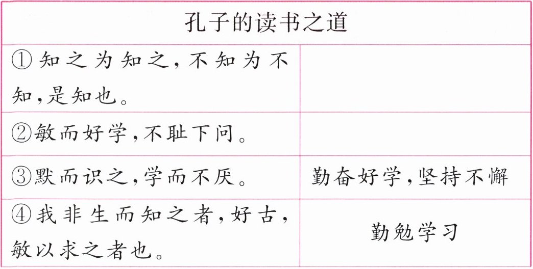 1. 梳理课文,填写表格,用四字词语概括孔子的读书之道。